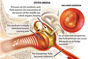 لإتصال الأذن الوسطى مع الأنف بواسطة قناة أوستاكي (Eustachian tube)، ويعتبر الإلتهاب الأكثر شيوعاً بين الرُضع والمعاقين.
