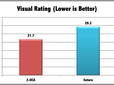 تيشو إيد(ثنائي أوكتيل سيانو اكريلات) يظهر نتائج تجميلية أفضل خلال سنة مقارنة بالخياطة الطبية (الغرز). بالإضافة إلى ذلك رضا المريض كان عالياً جداً في المجموعة التي تم معالجتها بثنائيأ وكتيل سيانو اكريلات.